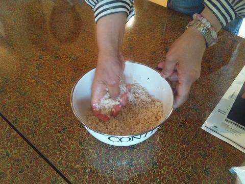まず乾燥糀をぬるま湯でもどし、塩を加えながら混ぜていきます。