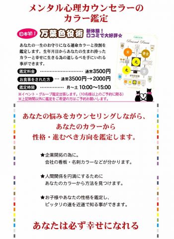 店内にてメンタル心理カウンセラーのカラー鑑定を行ってます。生年月日からあなたの生まれ持ったカラーと幸せに生きるための道しるべを手にいれる事ができます。一生に一度だけの鑑定体験をしてみませんか?